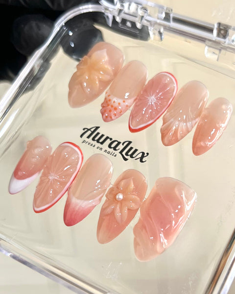 Warm peach and nude tones with abstract petal designs and subtle shimmer, creating a soft, elegant finish. Ideal for brunches, weddings, and feminine everyday looks.